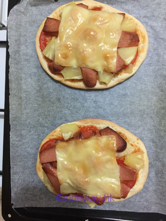 塗一層薄蕃茄醬,放上餡料:芝士,蕃茄,菠蘿和芝士腸