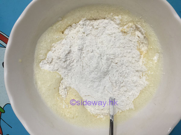 放混合粉(自發粉、糖、鹽)入奶(蛋黃和奶),用膠棒慢慢拌勻粉漿