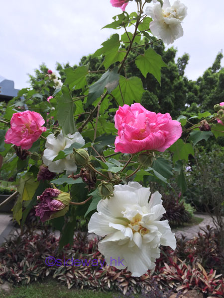 又圓又大的芙蓉花,花有白和粉紅色,花瓣有幼紋,花期約二、三個月