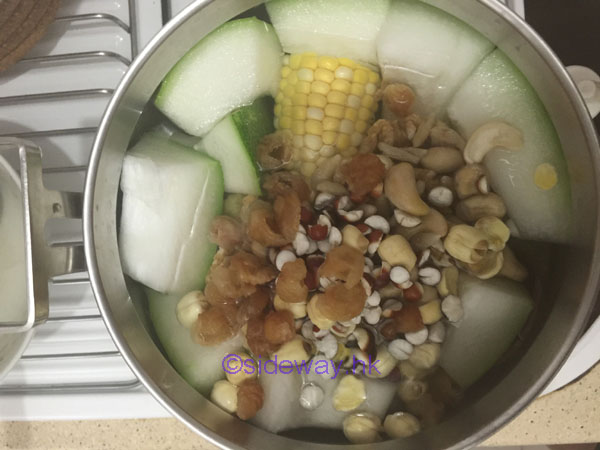 冬瓜去外皮和核,切塊 清洗粟米,切塊 清洗馬蹄去外皮 蓮子、茨實浸清水15分鐘 清洗腰果、合桃、麥冬、圓肉 清洗瘦肉,汆水 果皮浸入熱水10分鐘去囊