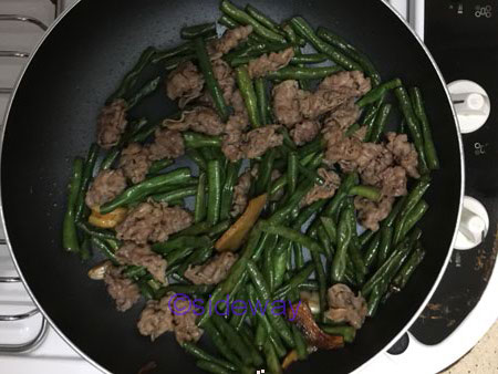 薑、蒜炒熟肥牛,備用 炒熟豆角,加入肥牛,炒勻