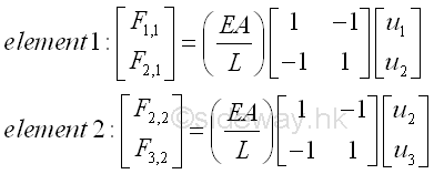 The two force-displacement equations for elements are only elemental equations of the 2 element sytem. Numerically, the force-displacement equations can be combined together to form a bigger system matrix form.