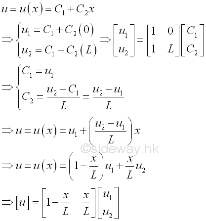 The displacement function can therefore be used to describe the displacement of each particle along the bar. The functions that used to multiply the nodal displacements u1 and u2 are therefore called shape functions or interpolation functions. The differentiation of the displacement function is equal to